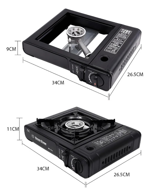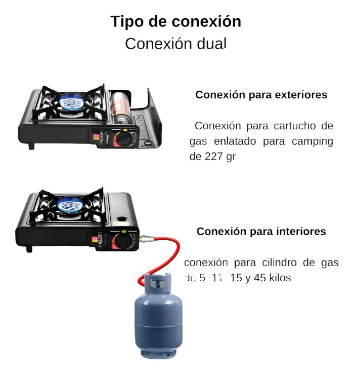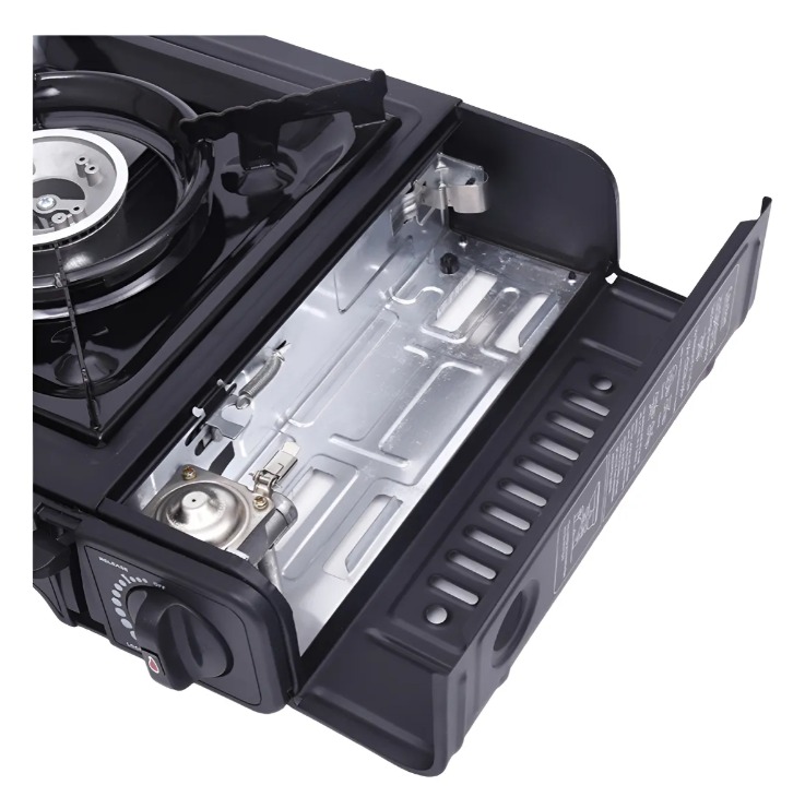 Cocinilla portátil a gas para camping con maleta. Compacta, ligera y fácil de manejar. Quemador de aluminio resistente a altas temperaturas, con buena disipación del calor. Diseño de válvula que previene la fuga de gas cuando no está en uso. Adecuada para acampar, cocinar al aire libre y como parte de un kit de emergencia para el hogar. Incluye estuche de transporte y manual de usuario. Encendido eléctrico cerámico que no necesita batería, se enciende rápidamente. Quemado eficiente y silencioso. Características: - Encendido eléctrico cerámico sin necesidad de batería. - Carga de gas instantánea y segura. - Control de ajuste de llama. - Diseño compacto y ligero. - Estuche de seguridad confortable. - Cuerpo desarmable para una limpieza sencilla. - Sistema interno de prevención de fugas. - Conexión dual para latas de gas de 227 gr y cilindros domésticos.