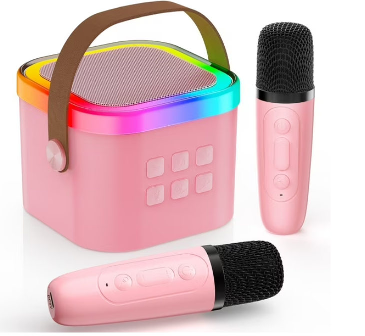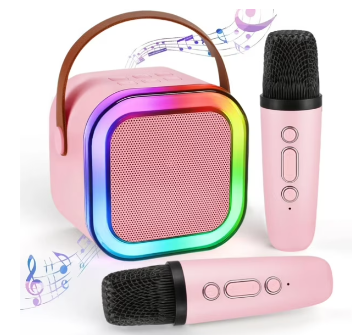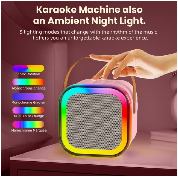 Con un diseño compacto, colorido y fácil de usar, este parlante incluye 2 micrófonos recargables, efectos de cambio de voz y luces LED que se pueden apagar si lo deseas. ¡La diversión está garantizada!